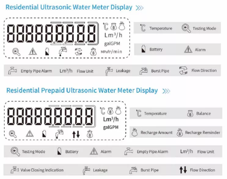 Display 9 digits LCD display volume, flow rate, power alarm, flow direction, output etc.